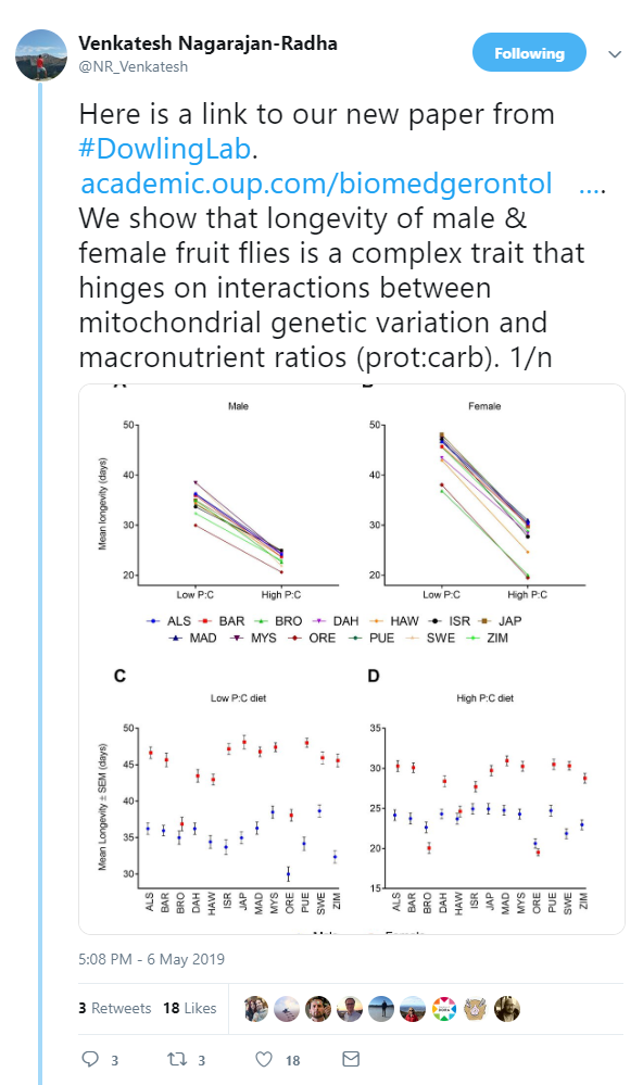 Hot off the press: Interactions between mitochondrial haplotype and dietary macronutrient ratios confer sex-specific effects on longevity in Drosophila melanogaster. V Nagarajan-Radha, J Rapkin, J Hunt, DK Dowling. The Journals of Gerontology: Series A. Published May 2019. Link